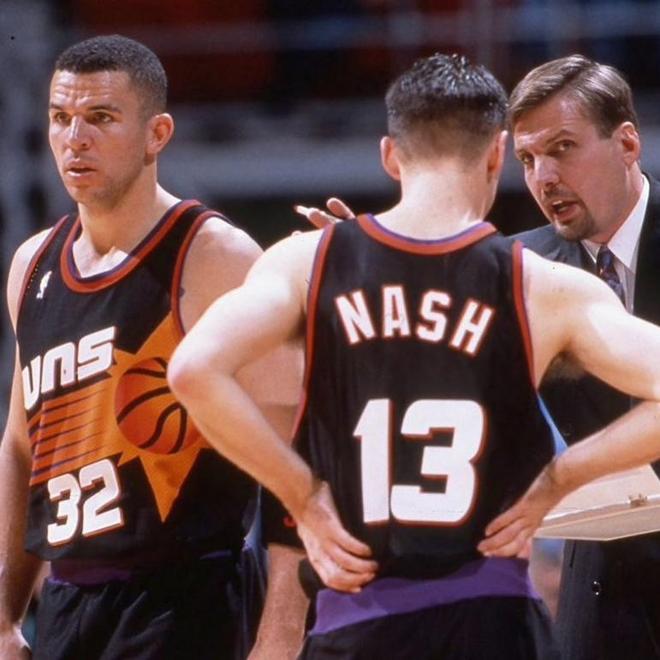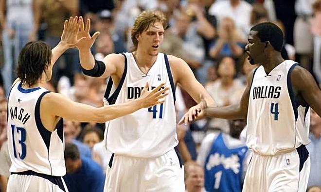 当然,纳什没有让老帅失望,成为首发后数据提升到了15.6分、3.2个篮板和7.3次助攻,进攻端不仅拥有一手稳定的组织能力,而且三分投射也是非常精准,而小牛队也是正式打造了纳什、诺维茨基和迈克尔·芬利的三驾马车体系,成功打进了季后赛的舞台。紧接着在01-02赛季,纳什继续提升,数据来到了17.9分、3.1个篮板和7.7次助攻,入选了最佳第三阵容,还第一次进入了全明星阵容,帮助球队拿到了57胜25负的战绩。当然,最值得被铭记的还是02-03赛季,这一年的小牛队不仅拿到了创造队史最佳记录的60胜22负的战绩,而且还历史性打进了西部决赛,29岁的纳什在即将不如而立之年,终于完成了逆袭。虽然后来被老板马克·库班看衰,未能留在小牛队,但纳什却回到了菲尼克斯,并且打出了生涯的巅峰表现,拿到了两座MVP,成为了太阳队的队史最佳球员。