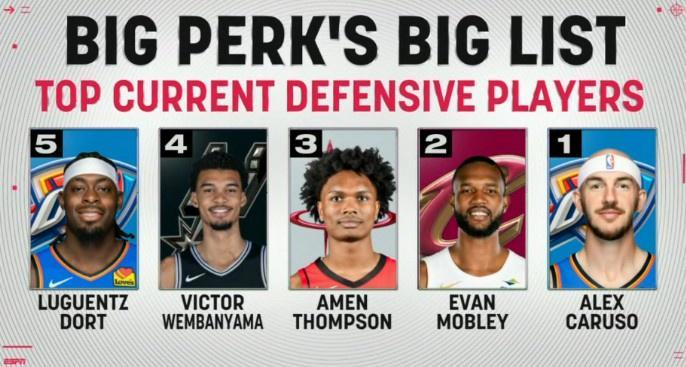 帕金斯排现役防守最强前5:卡鲁索第1阿门第3文班第4多特第5